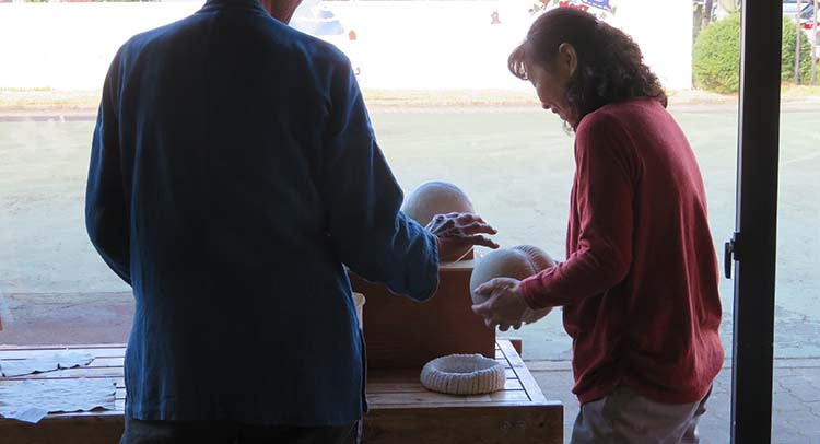 けまり工房にて鹿皮をバックにした小林信一先生(左:2019年11月2日)